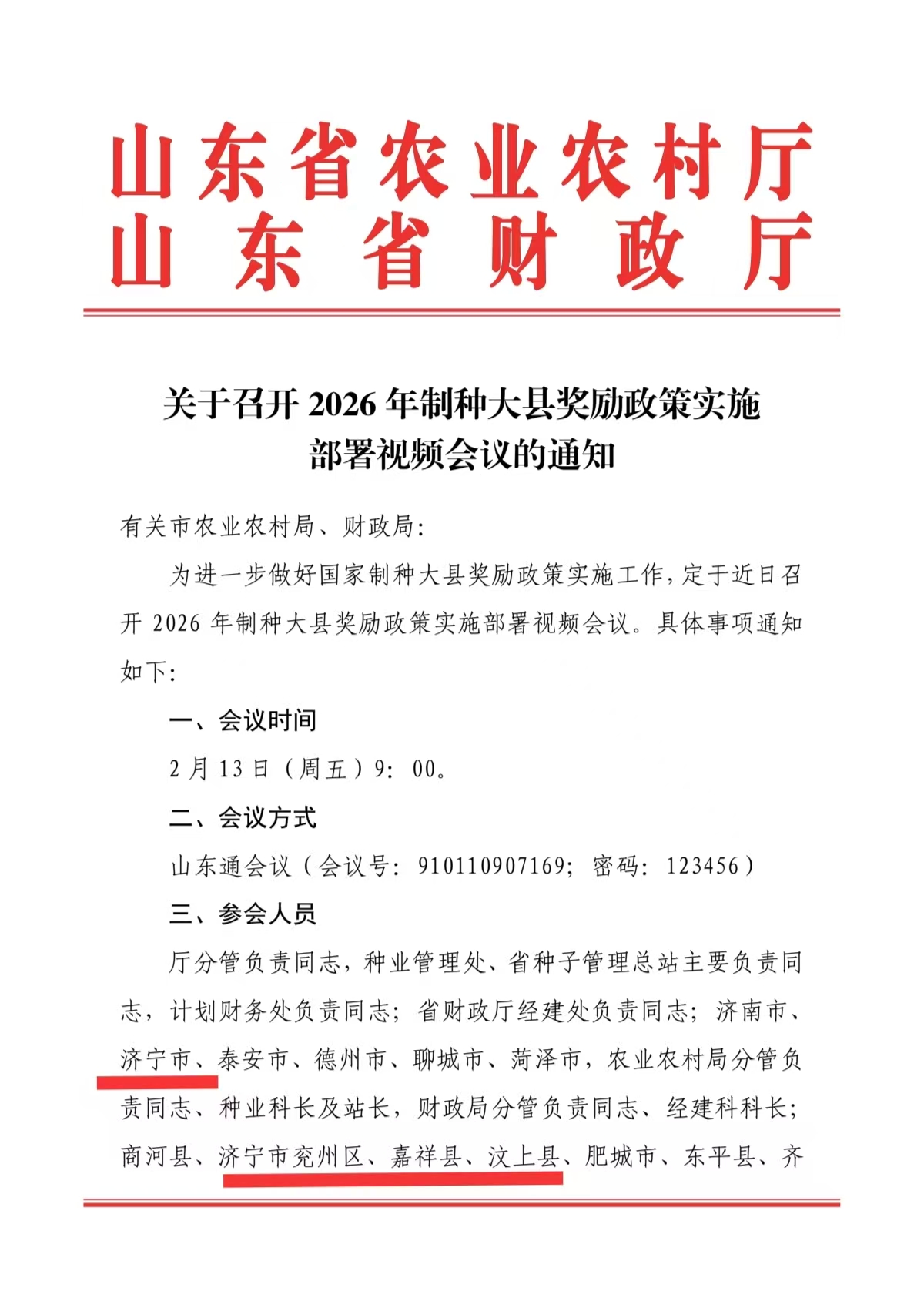 2026年2月13日,山东省农业农村厅、财政厅召开2026年制种大县奖励政策实施视频会,我市兖州区、嘉祥县、汶上县再次获批国家制种大县,总数3个、居全省首位(全省共9个)。这是继我市省级区域性良繁基地数量全省夺冠后,斩获的又一重磅殊荣,为我市“十五五”种业高质量发展注入强劲动能,为打造全国一流制种基地、建设现代种业强市奠定坚实基础。 一、荣膺国家制种大县,挺起济宁种业“硬脊梁” 国家级制种大县是保障国家粮食安全和农业生产用种的核心载体,是衡量区域种业发展水平的最高“国字号”认证。我市3个县(区)同步入选、数量全省第一,标志着济宁制种产业规模、基础设施、保障能力全面跻身全国第一方阵,对全市种业振兴具有里程碑意义。我市将以此为契机,加快构建育繁推一体化、产加销全链条的现代种业体系,全力推动由“种业大市”向“种业强市”跨越。 二、聚力基地提质增效,筑牢良种繁育“压舱石” 国家级制种大县认定,既是对我市制种基础和综合实力的充分认可,也为基地提档升级带来重大政策机遇。我市将聚焦规模化、标准化、集约化、机械化、信息化“五化”方向,持续完善农田水利、田间道路、晾晒仓储等基础设施,强化建后管护,在现有优势基地基础上改造提升、培优做强,不断提升耕地质量、制种产量和良种品质,稳定优势繁种面积,吸引更多优质制种企业集聚落地。 三、锚定一流靶向发力,打造全国种业“新高地” 种业振兴,责任在肩、使命如磐。下一步,我市将坚决扛牢粮食安全政治责任,聚焦制种基地“建好、管好、用好”关键环节,发挥小麦、大豆等优势作物种业特色,加快建设数字化、智能化现代制种综合体,推动种业龙头企业与优势基地深度共建,做强种业“芯片”、做优基地载体、做大产业集群,全力打造全国一流制种基地和重要粮油作物良种供应保障区,以济宁种业高质量发展,为端牢中国饭碗、保障国家粮食安全作出更大贡献。 |